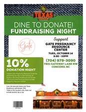 Texas Roadhouse will donate 10% of your total food purchases to GATE Pregnancy Resource Center